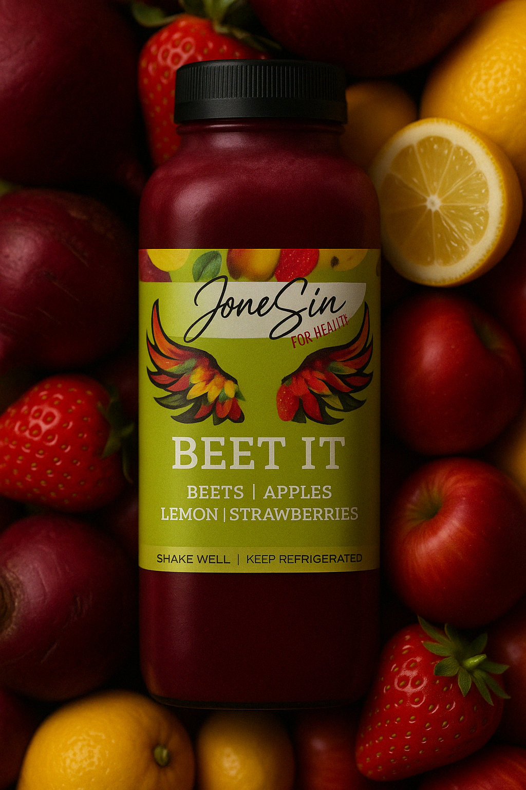 Beet it, bad vibes! This bold blend pumps up your blood flow, chills out your pressure, and gets your glow goin’. With beets, lemon, strawberries, and apples, it’s a heart-happy, skin shinin’, feel good kind of sip.